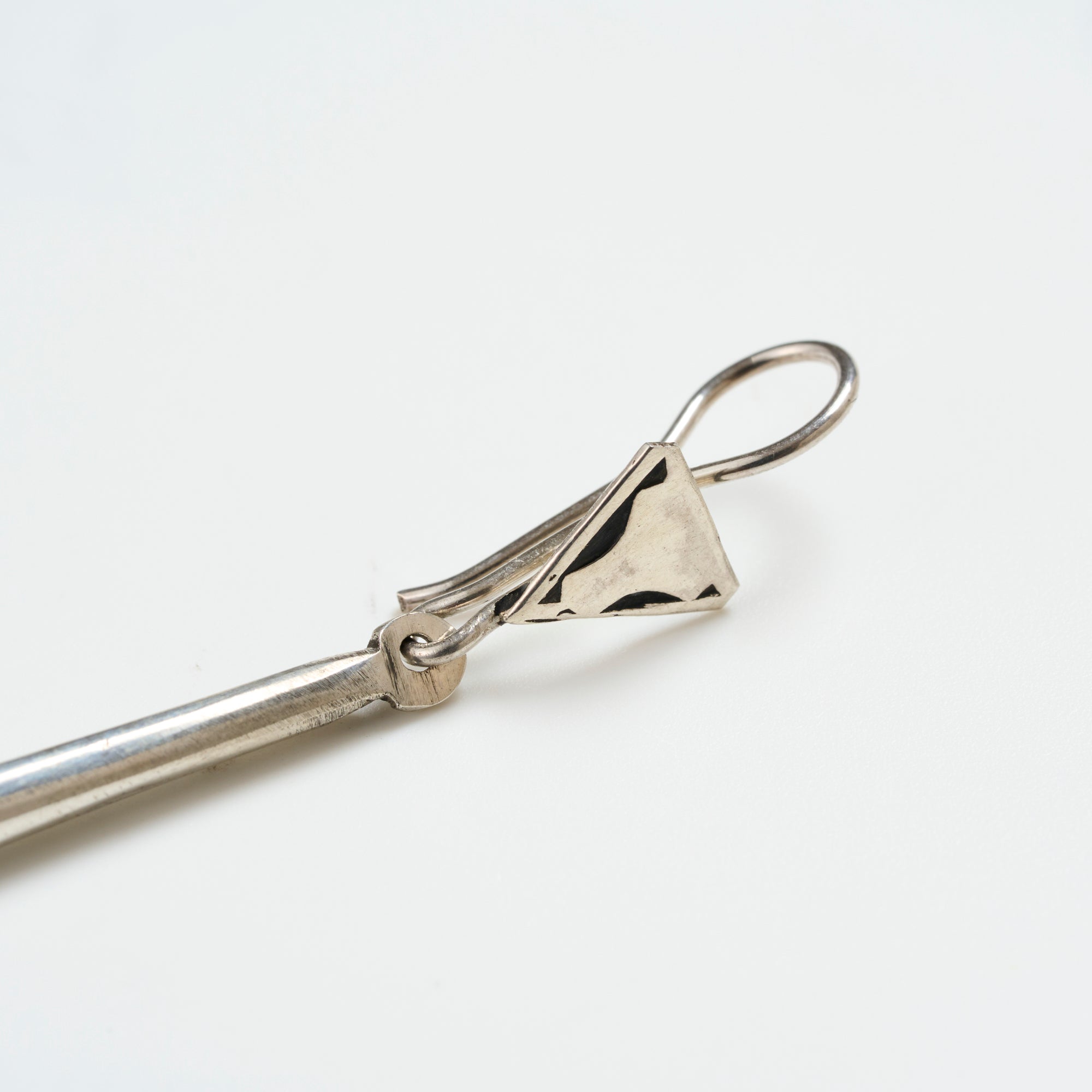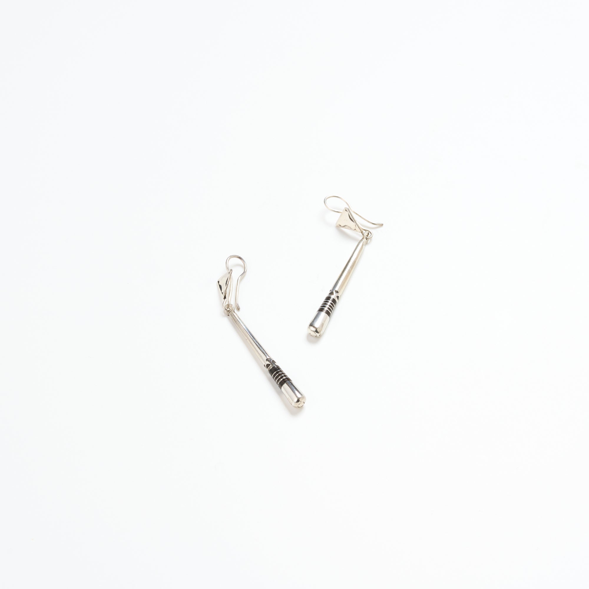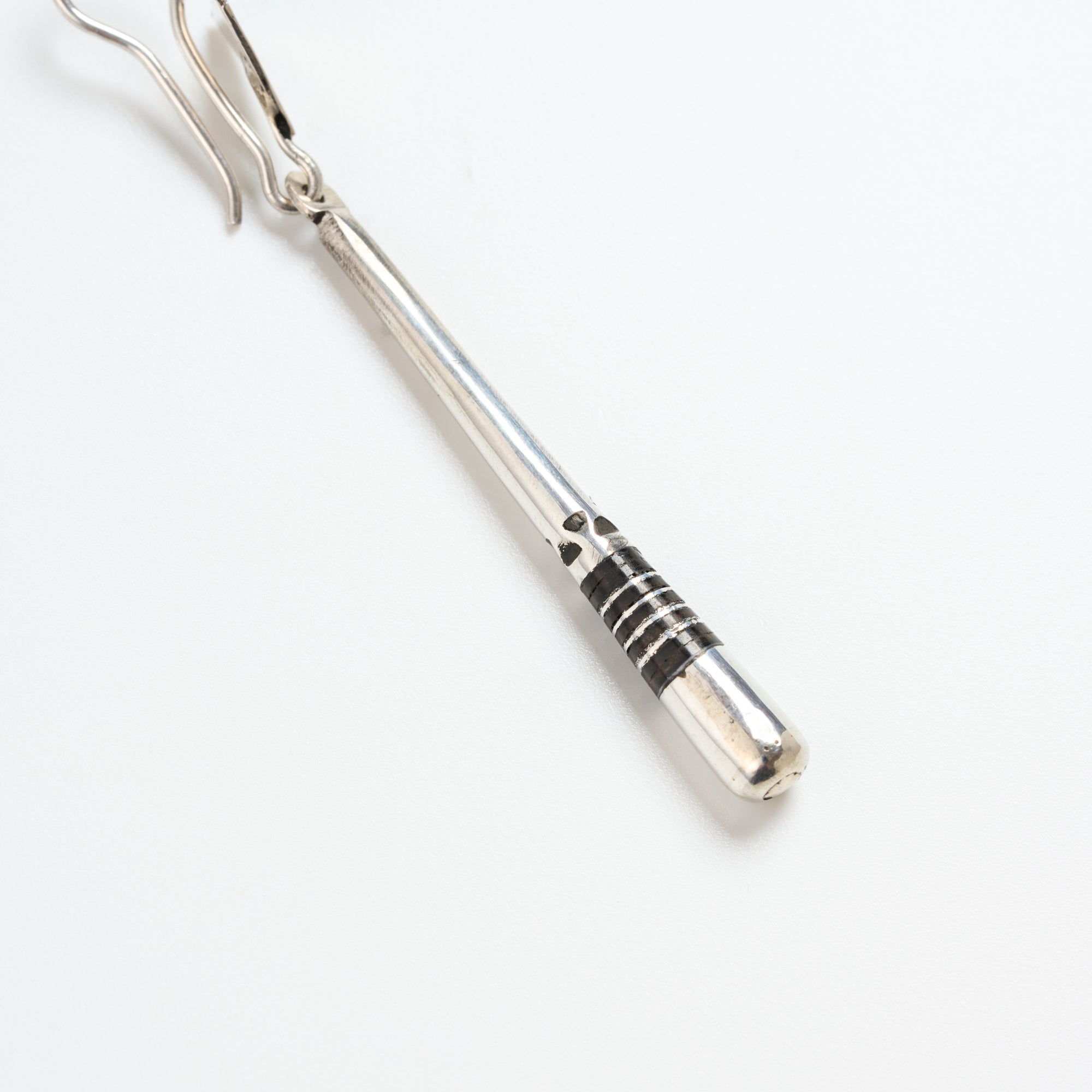 一つ一つ手彫りで丁寧に彫られた表面の美しい文様には、それぞれ意味があり、事物、物語、寓意などを象徴しています。ベースがとても細く繊細なラインが特徴で、先端近くの黒のラインには非常に堅い木材のエボニーウッドが使われ、細かな技術と伝統的なデザインが魅力です。(*エボニーウッドとは、黒檀という木のことで、アジアからインドを抜けてアフリカまで分布している銘木)華奢なデザインですが動くと程よく揺れて目を引くため、さりげないアクセントとしてご使用頂けます。角を落とした滑らかな表面感が柔和な印象です。