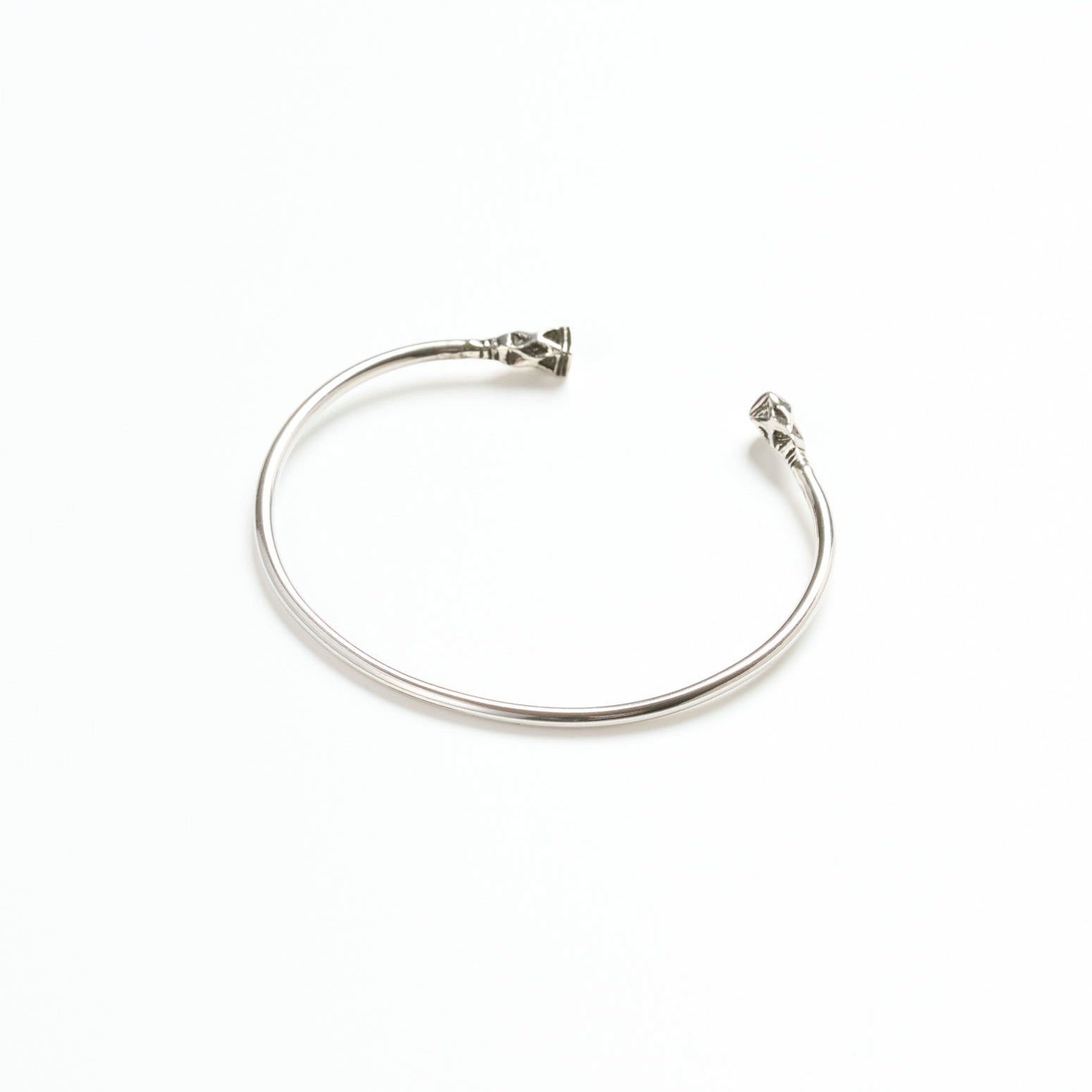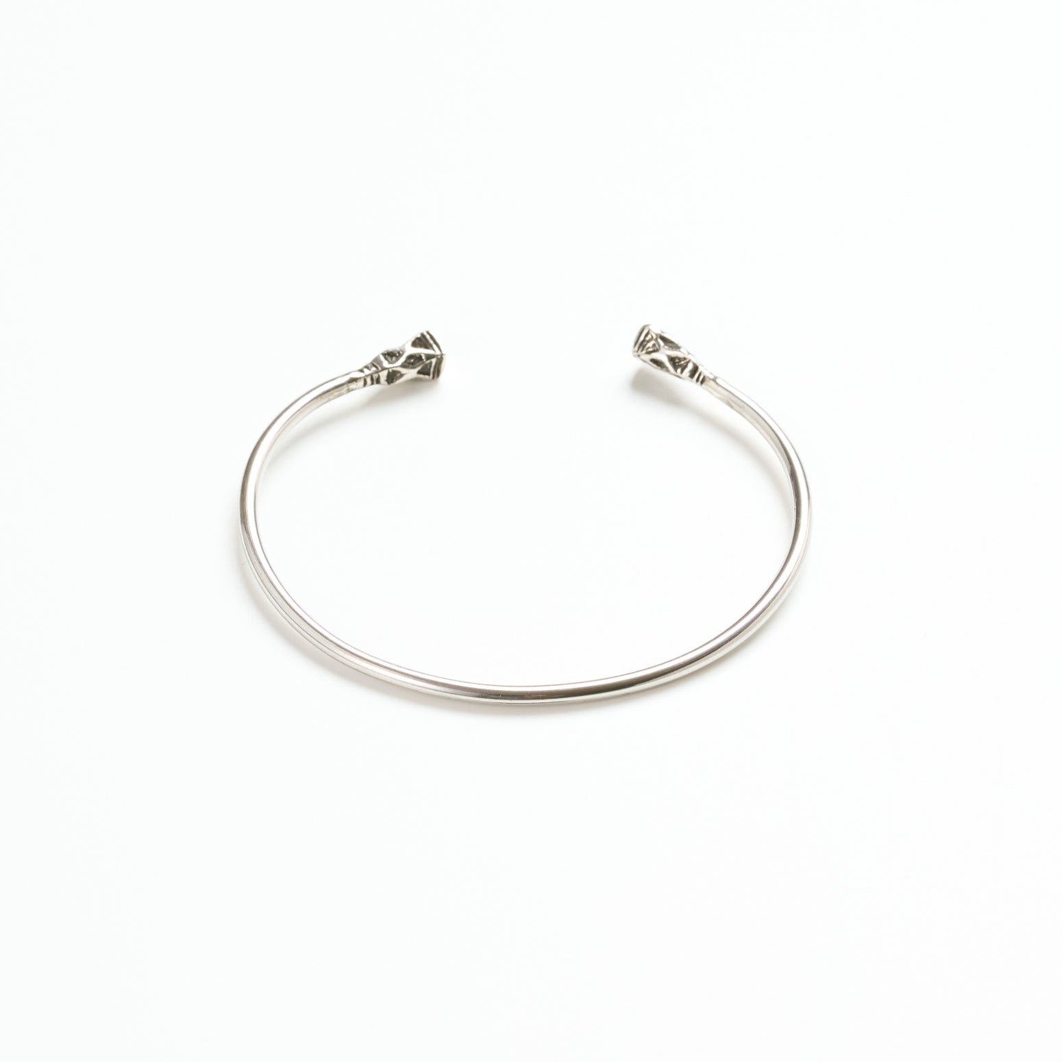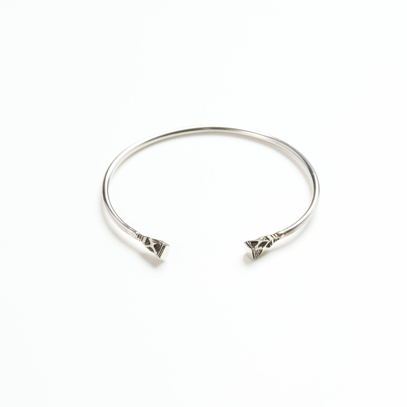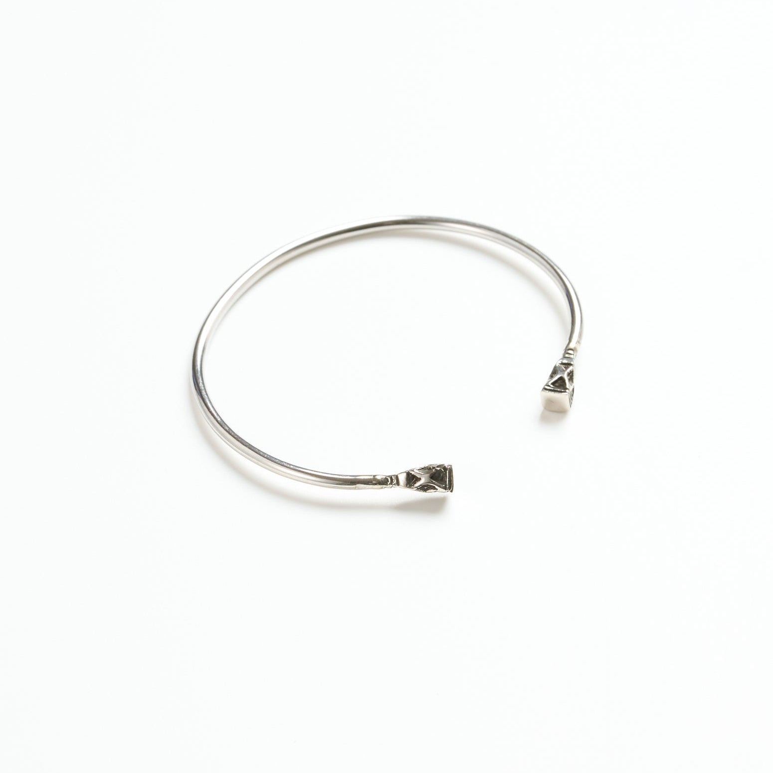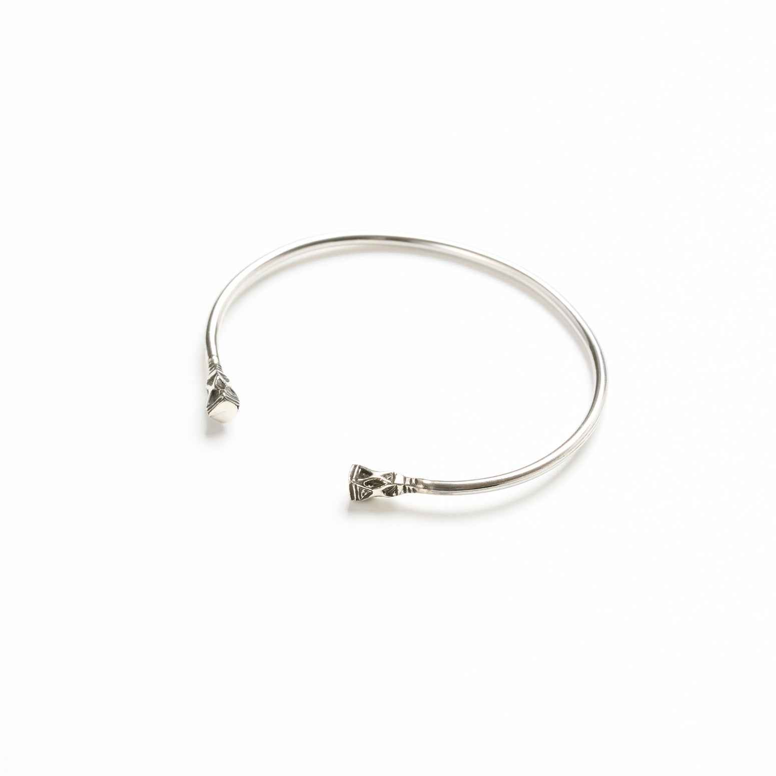 全体は細身で滑らかな円弧を描き、無駄を削ぎ落とした静かな佇まい。その両端にのみ、彫金模様が施されています。トゥアレグに受け継がれてきた銀細工の技を、極めてミニマルなフォルムに落とし込んだデザインです。
