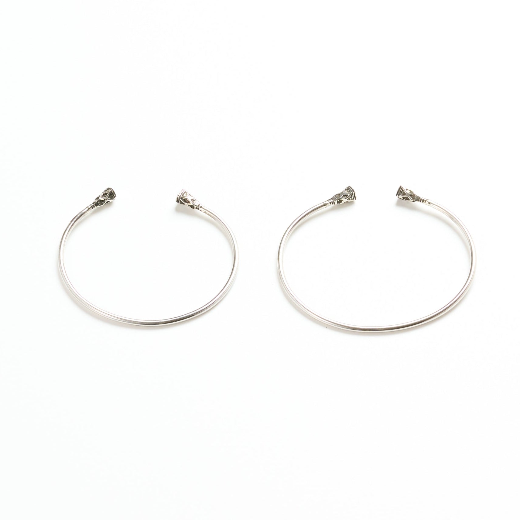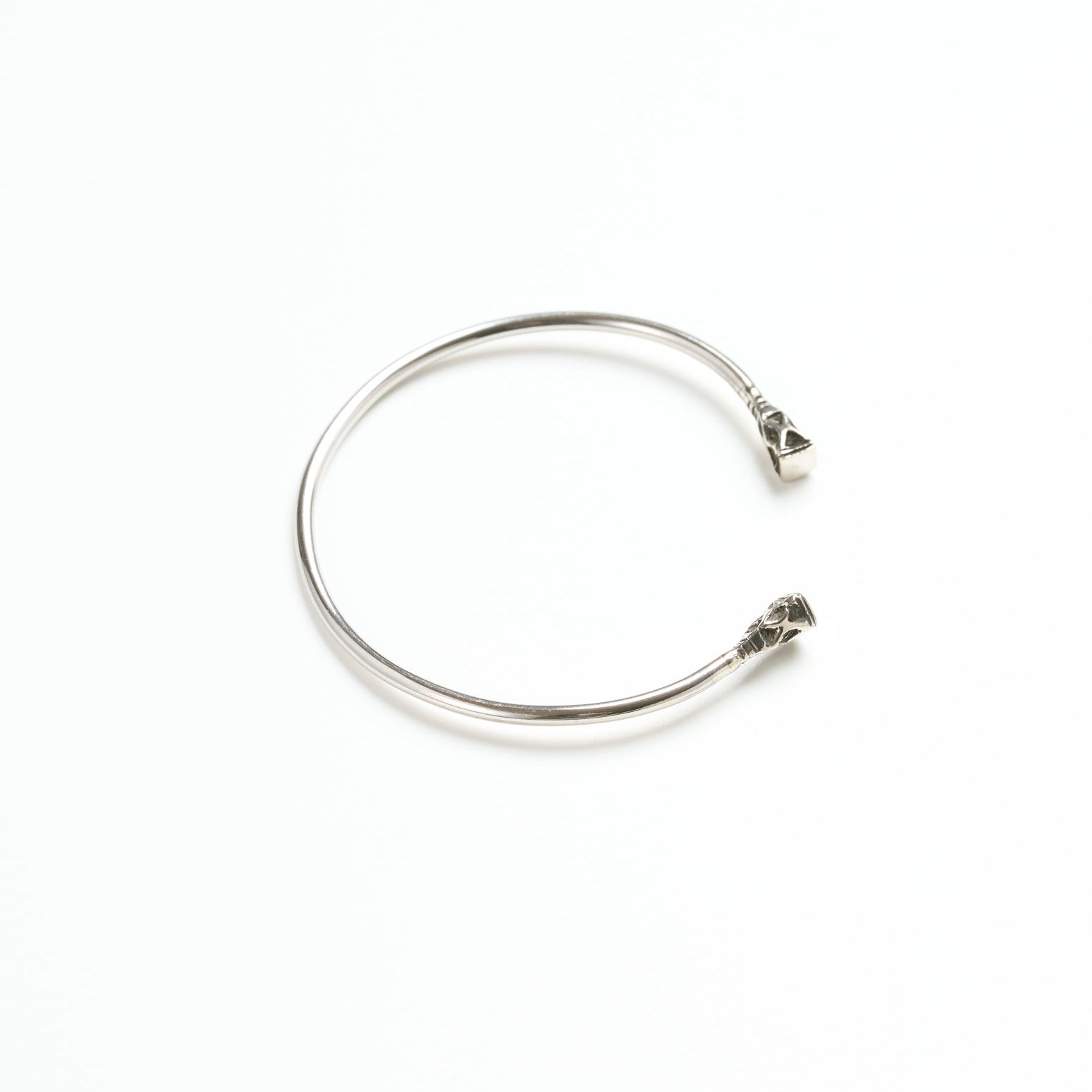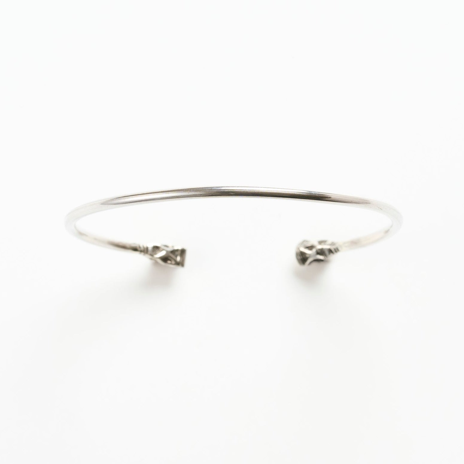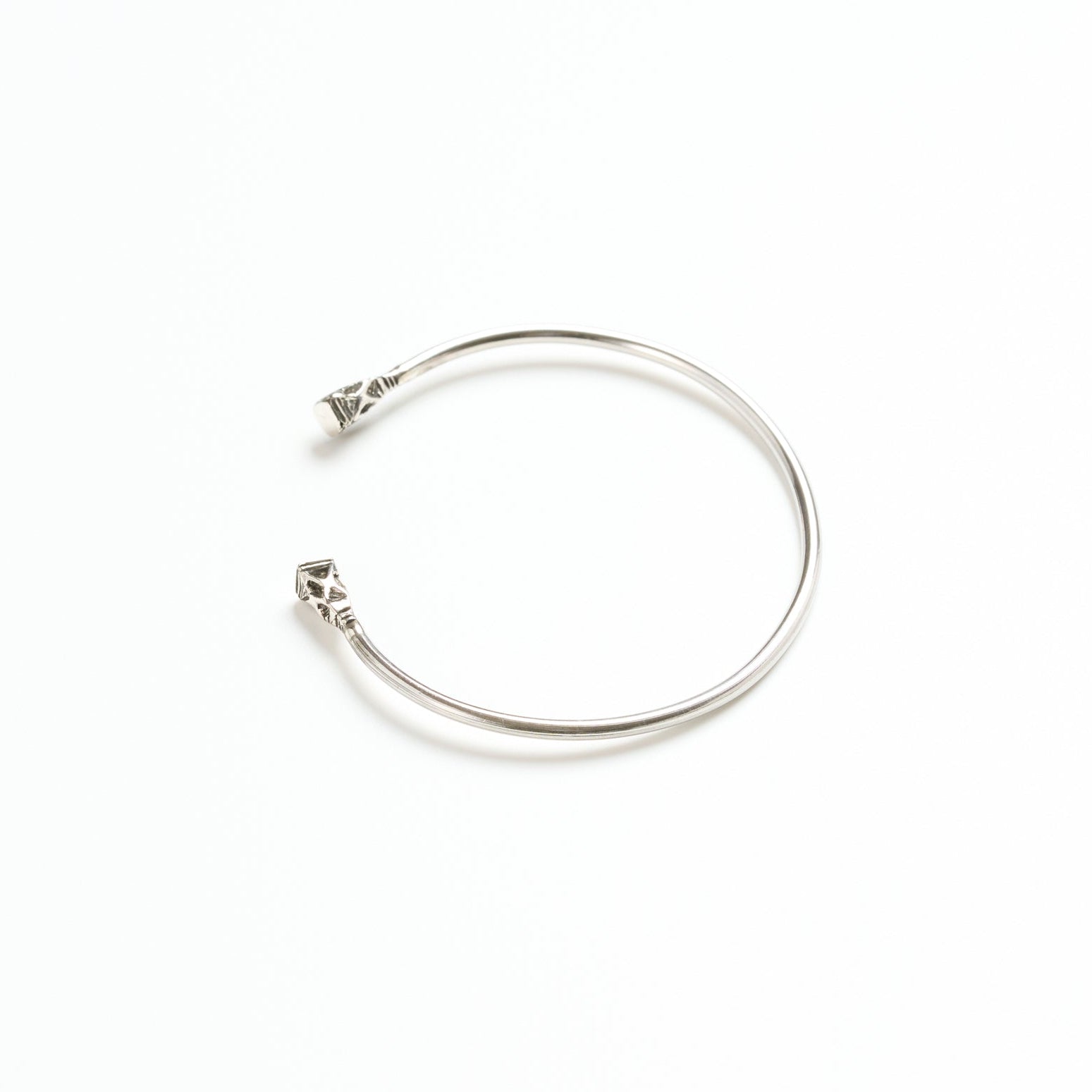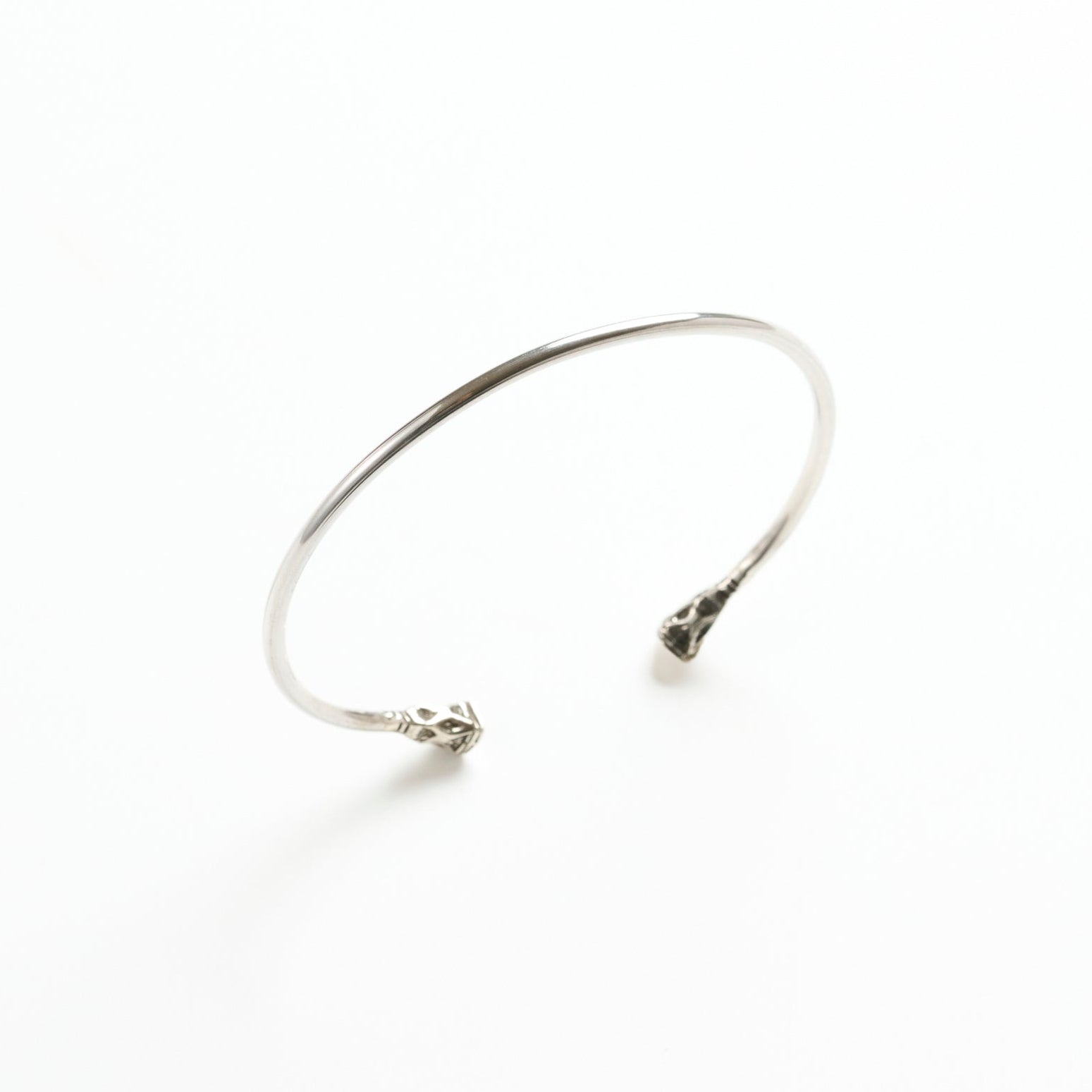 全体は細身で滑らかな円弧を描き、無駄を削ぎ落とした静かな佇まい。その両端にのみ、彫金模様が施されています。トゥアレグに受け継がれてきた銀細工の技を、極めてミニマルなフォルムに落とし込んだデザインです。